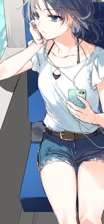 Safebooru - 1girl Arm Support Belt Black Bra Blue Eyes Bra Bra Peek Bra